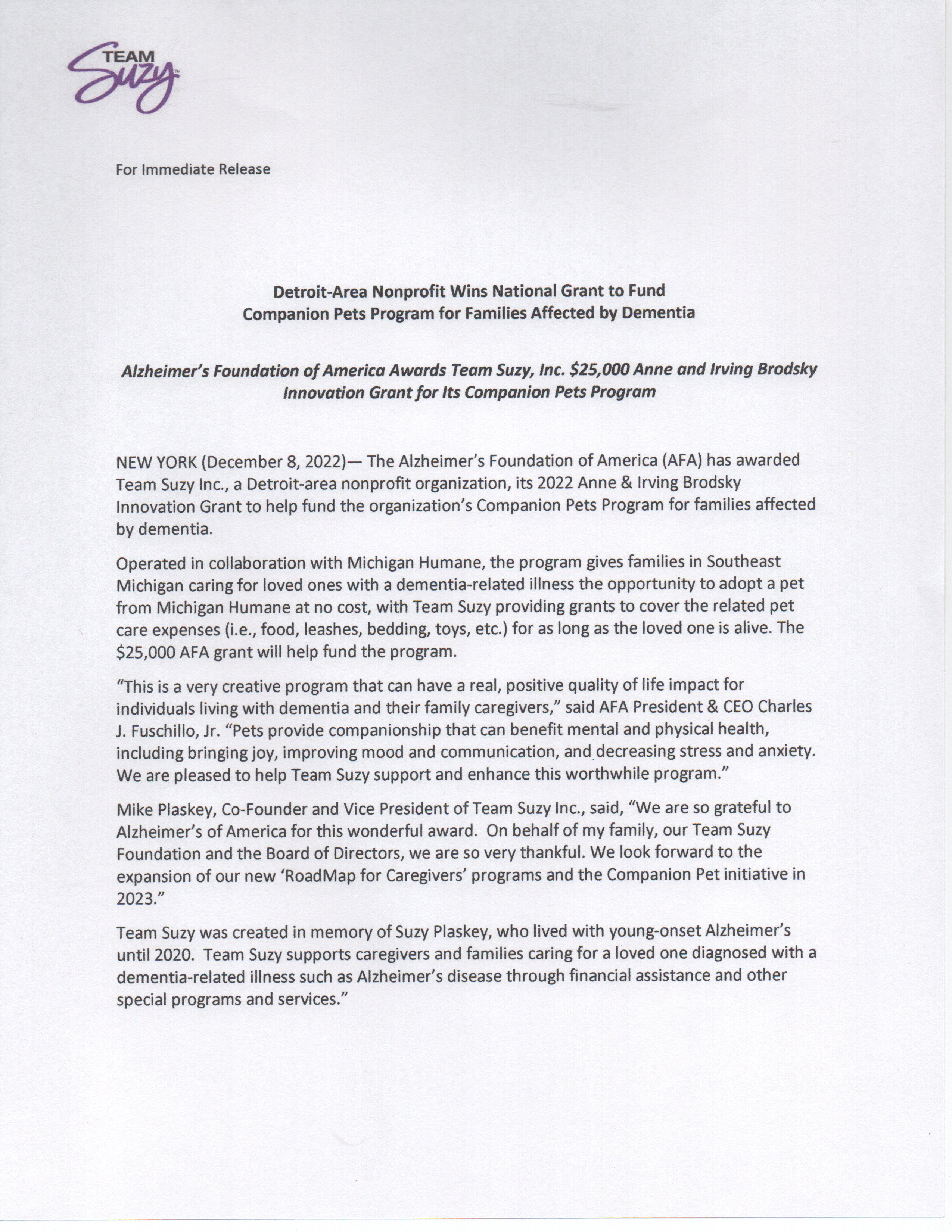 March 2022: Team Suzy Partners with Michigan Humane